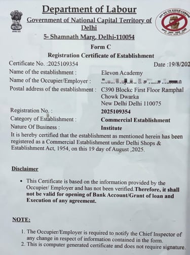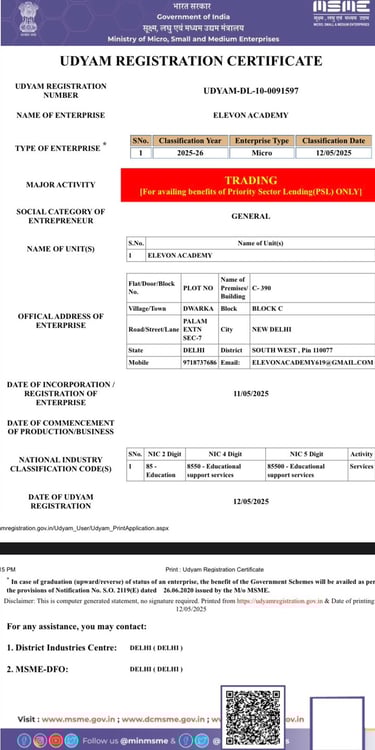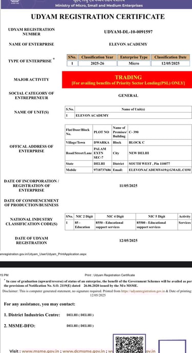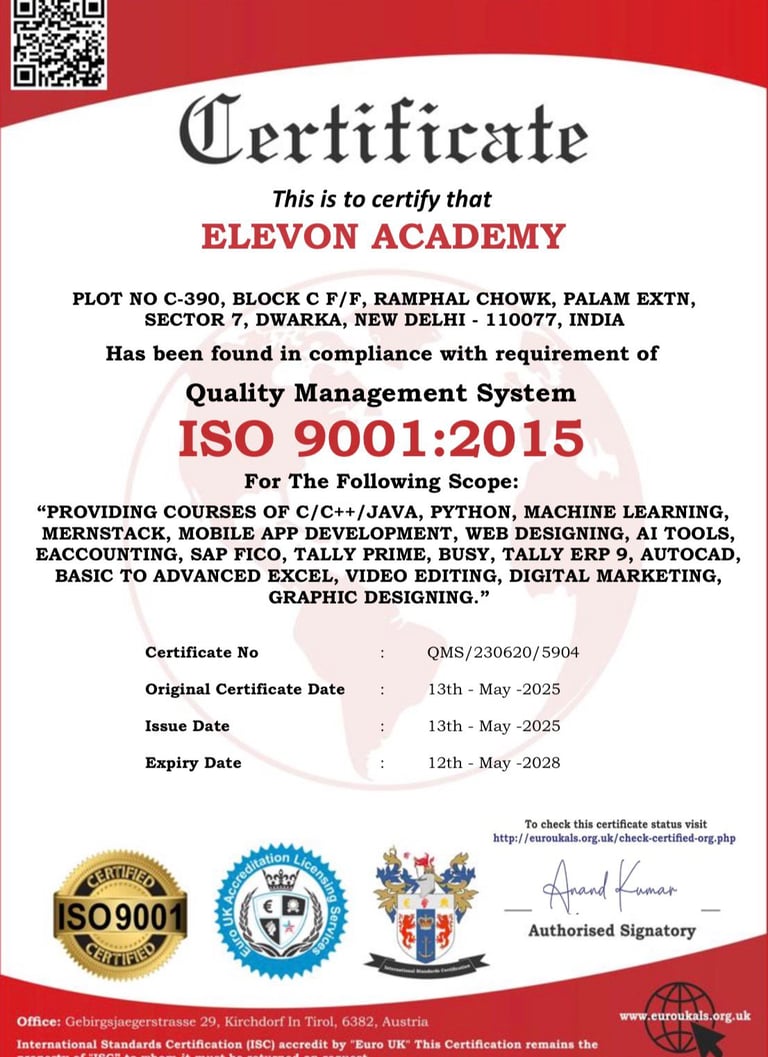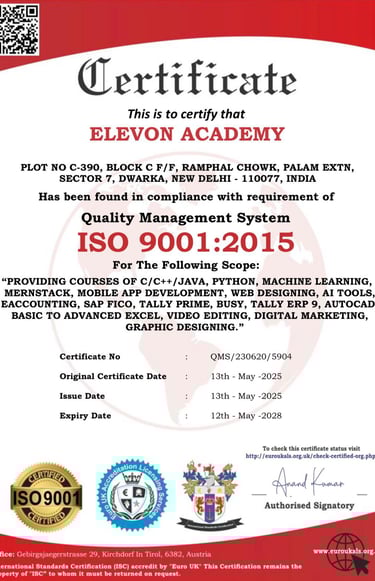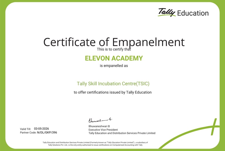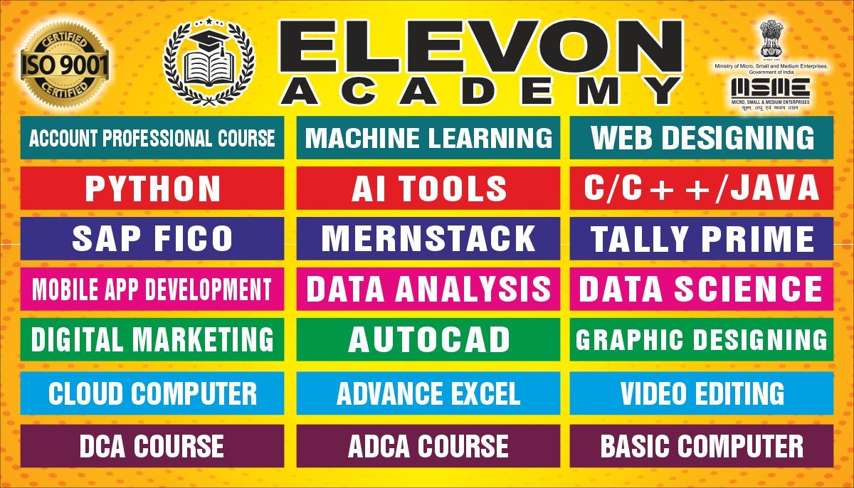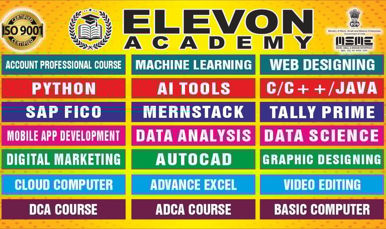 Welcome to ELEVON ACADEMY, a premier Education Center located in Dwarka, committed to empowering students and professionals with industry-relevant skills. We offer a wide range of cutting-edge courses, including Web Development, Full Stack Development, Data Analysis, SAP FICO, Tally Prime, Machine Learning, Advanced Excel, Programming Mastery, Core Java, Mobile App Development, Digital Marketing, Video Editing, Graphic Designing, Basic Computer and AutoCad. At ELEVON ACADEMY, we focus on practical learning, expert mentorship and career readiness, helping you build a strong foundation for a successful future in the digital world. We are authorized by Tally Skill Incubation Centre(TSIC).