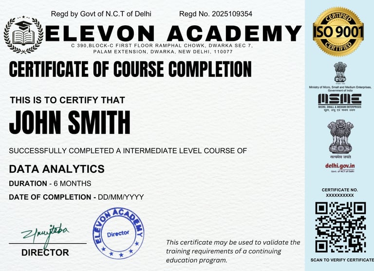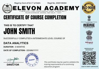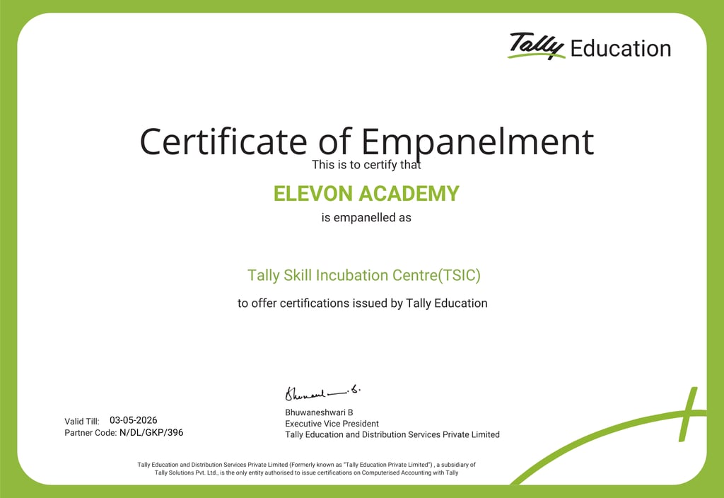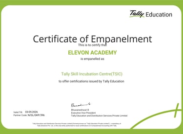 Welcome to ELEVON ACADEMY, a premier Education Center located in Dwarka, committed to empowering students and professionals with industry-relevant skills. We offer a wide range of cutting-edge courses, including Web Development, Full Stack Development, Data Analysis, SAP FICO, Tally Prime, Machine Learning, Advanced Excel, Programming Mastery, Core Java, Mobile App Development, Digital Marketing, Video Editing, Graphic Designing, Basic Computer and AutoCad. At ELEVON ACADEMY, we focus on practical learning, expert mentorship and career readiness, helping you build a strong foundation for a successful future in the digital world. We are authorized by Tally Skill Incubation Centre(TSIC).